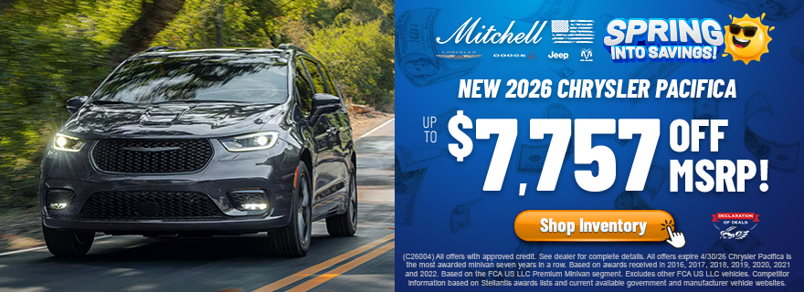 (C26004) All offers with approved credit. See dealer for complete details. All offers expire 4/30/26. Chrysler Pacifica is the most awarded minivan seven years in a row. Based on awards received in 2016, 2017, 2018, 2019, 2020, 2021 and 2022. Based on the FCA US LLC Premium Minivan segment. Excludes other FCA US LLC vehicles. Competitor information based on Stellantis awards lists and current available government and manufacturer vehicle websites.