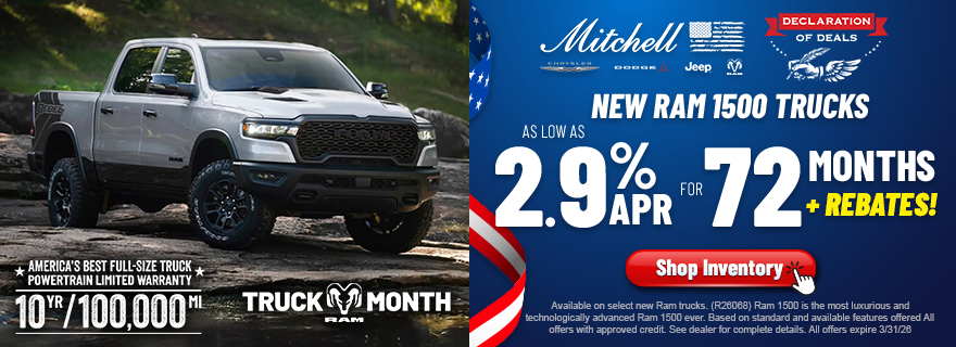 Available on select new Ram trucks. (R26068) Ram 1500 is the most luxurious and technologically advanced Ram 1500 ever. Based on standard and available features offered All offers with approved credit. See dealer for complete details. All offers expire 3/31/26.